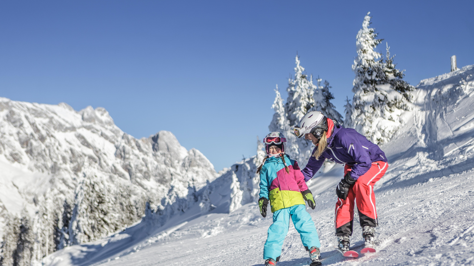 À propos „erlernen“ – die örtlichen Skischulen und Snowboardschulen sind wirklich gut darin, dir und deinen Kindern das Skifahren und Snowboarden beizubringen oder die Technik noch weiter zu optimieren. Denn wenn du Urlaub in diesem tollen Skigebiet machst, dann sollst du die Pisten auch mühelos erfahren können, mit einem Skikurs ist das absolut kein Problem. Die top-ausgebildeten Skilehrerinnen und Skilehrer helfen dir und deinen Kids dabei. Für letztere gibt es ein eigenes Kinderland mit Übungspisten und vielen weiteren spannenden Attraktionen, zum Kursabschluss ein lustiges Skirennen, und wenn du möchtest auch Mittagsbetreuung mit Kindermenüs. Die perfekte Skiausrüstung gibt es in einem der Skiverleihe im Ort oder online zu buchen.